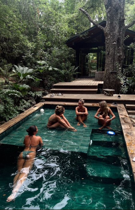 Follow winding wooden pathways through the forest to find the hot pool, a hidden retreat immersed in nature. Set to 102°F or your preferred temperature, it features a submerged mezzanine for in-water seating, perfect for unwinding.